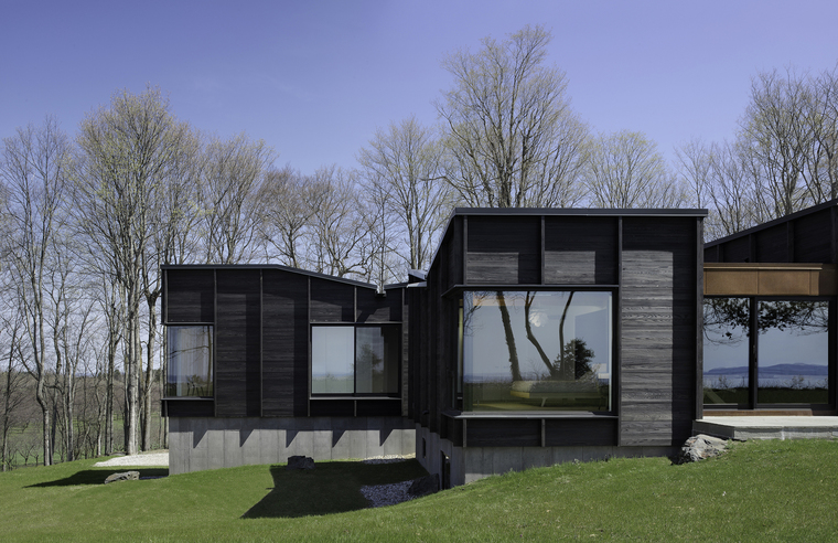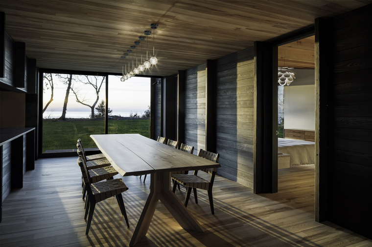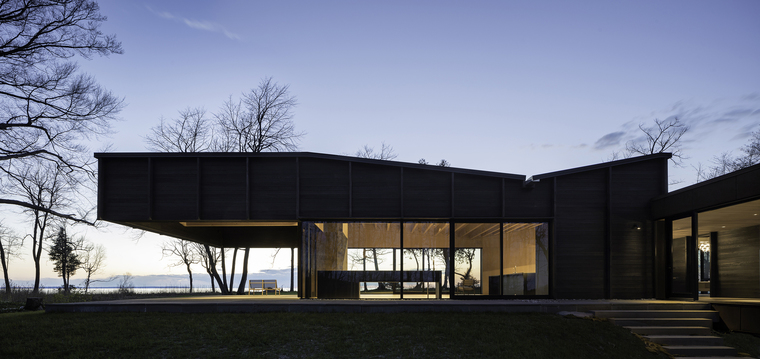 小木屋,從小木屋可以俯瞰到美麗的密歇根湖。小木屋由三種結構構建而成,用于聚集空間的結構包含了客廳、廚房、觀景休息平臺,而其他兩個結構是用來支撐主臥和三個小孩子的臥室的。餐廳的走廊連接了這三部分結構。有著微微的起伏屋頂,隨著自然地形的變化,成為附近漁民一個俏皮的參考物。
