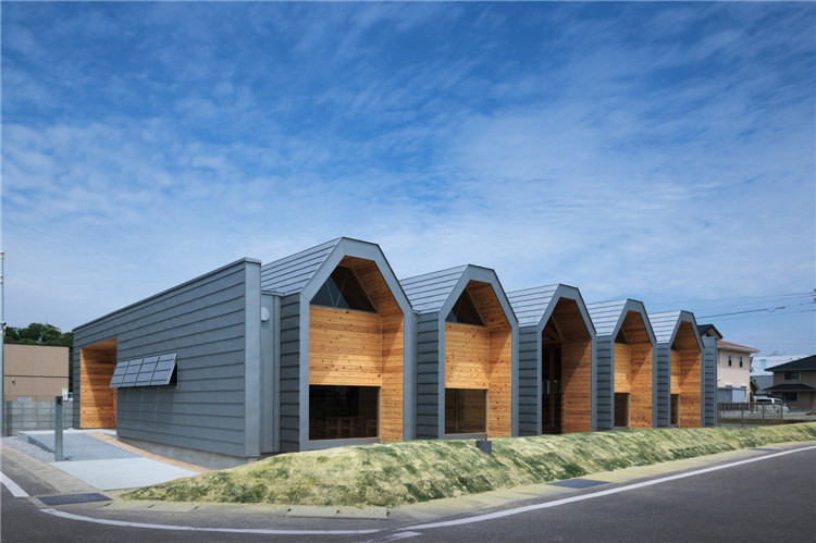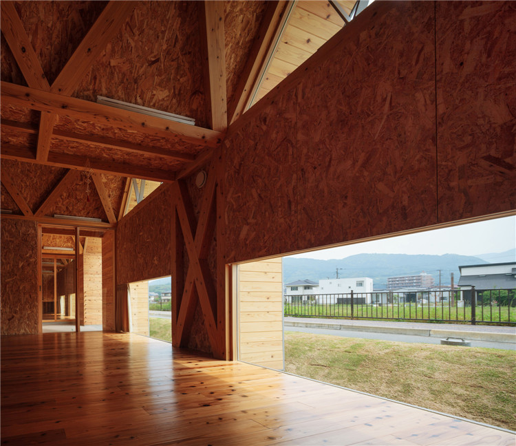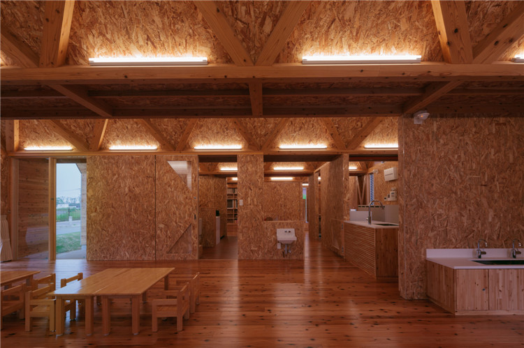 本案托兒所位于福岡市附近的太宰府市,為了容納更多的孩子,不得不增加為兩個(gè)班級(jí)??紤]到日本全國(guó)范圍的出生率下降,不久的將來這里的孩子數(shù)量可能會(huì)減少,因此建筑師決定建造一座只有一室空間(9米跨度)的建筑,內(nèi)部沒有支柱,方便各種用途(游戲室等)的轉(zhuǎn)換。木桁架梁在工廠安裝,用拖車運(yùn)送到施工現(xiàn)場(chǎng)。復(fù)雜的連接也是在工廠制作的,只有一個(gè)相對(duì)容易的連接在現(xiàn)場(chǎng)組裝。這樣的方式提高了施工精度,縮短了施工工期。