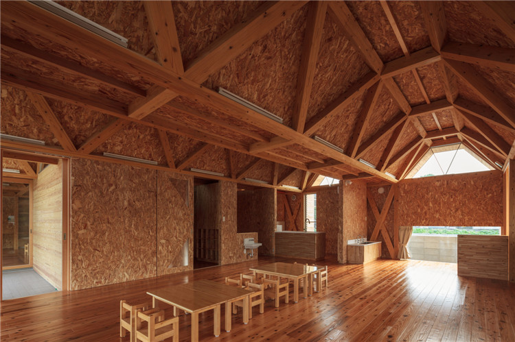 屋頂結(jié)構(gòu)采用折疊板設(shè)計(jì),無柱空間是通過運(yùn)用木桁架梁屋頂結(jié)構(gòu)實(shí)現(xiàn)的,形狀像一塊折疊板。所有支撐屋頂結(jié)構(gòu)的承重墻都被布置在建筑外圍?,F(xiàn)在這座建筑分成了兩個(gè)保育室、衛(wèi)生間等,但將來也可以轉(zhuǎn)換為一個(gè)大房間。