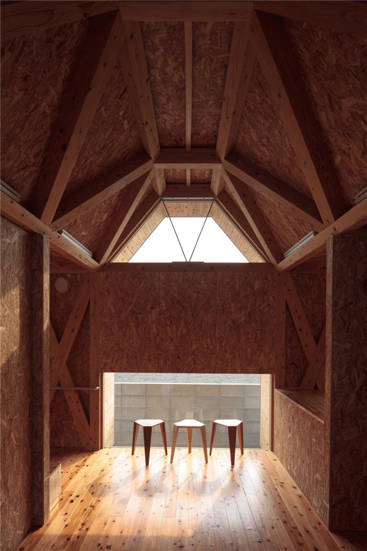 建筑的所有結(jié)構(gòu)不是天花板就是墻體,木桁架梁傾斜設(shè)置,是屋頂?shù)幕A(chǔ)結(jié)構(gòu)木構(gòu)件。這樣的設(shè)計(jì)滿足了客戶對(duì)于“保育室被木頭包圍”的要求,減少了建設(shè)成本。此外,通過降低天花板的高度,木材長(zhǎng)度被縮短了,對(duì)空調(diào)的需求也降低了。由于天花板幾何形狀不規(guī)則且窗戶為梯形,因此雖然天花板最低的地方只有2.2m左右,但即使是成年人也不會(huì)感到壓抑。