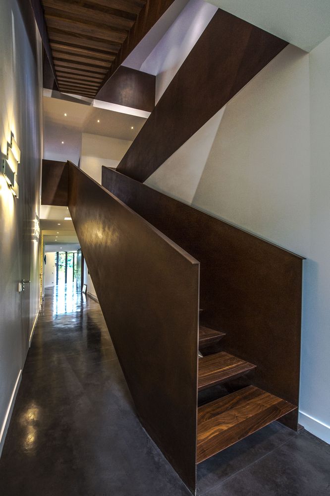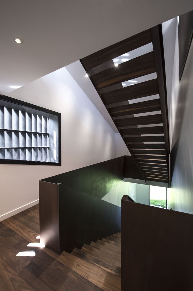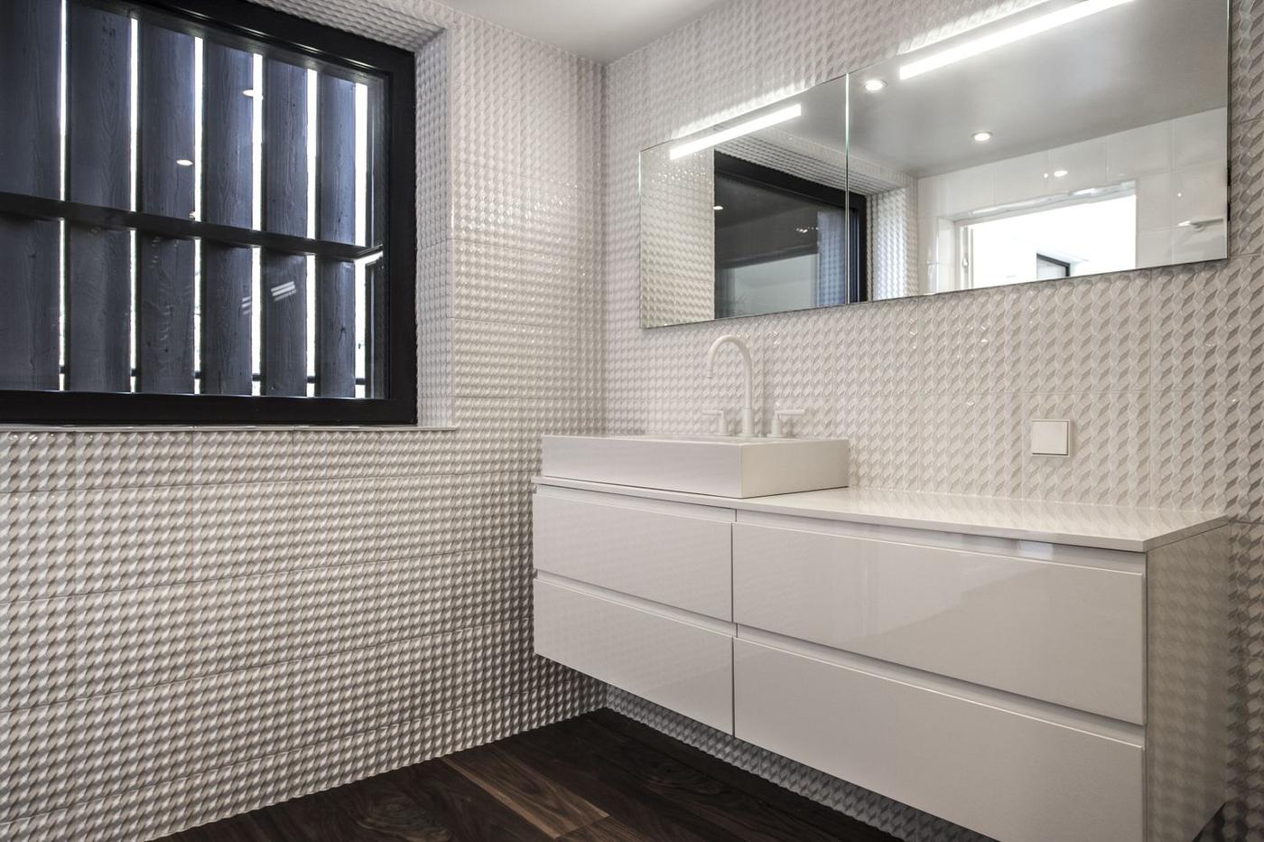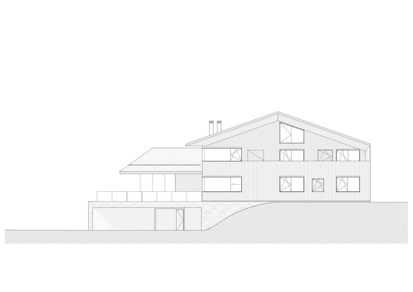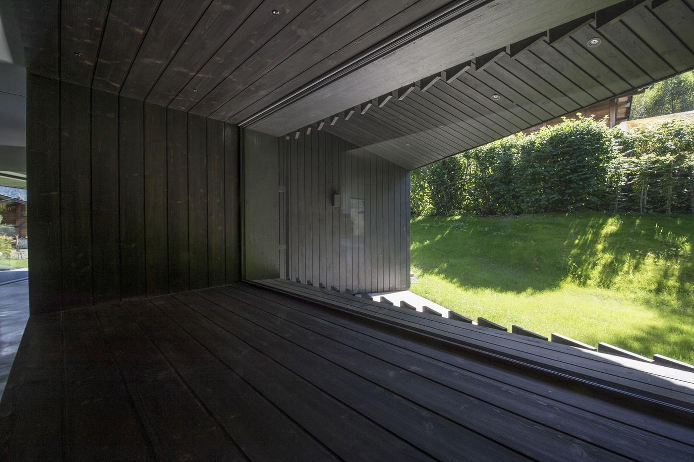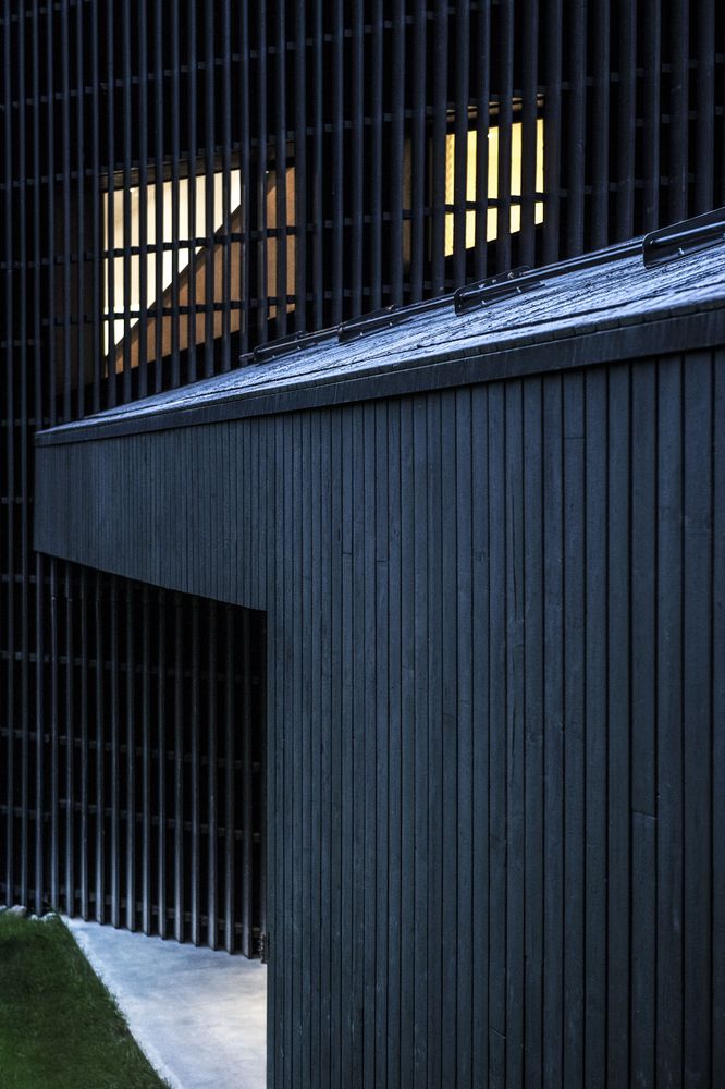 落葉松木板用于建筑主要外墻的百葉窗覆層系統(tǒng),以便保證地面層和2層的浴室擁有良好的視野。 用于外墻的落葉松木經(jīng)過(guò)特殊的加熱處理,以便保持顏色的持久并防止煙灰的附著。