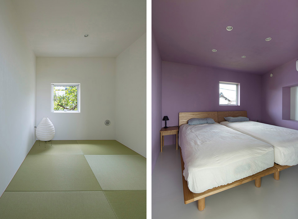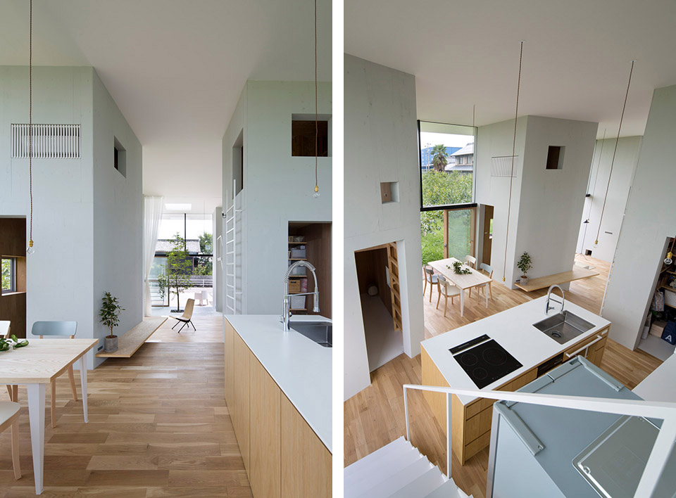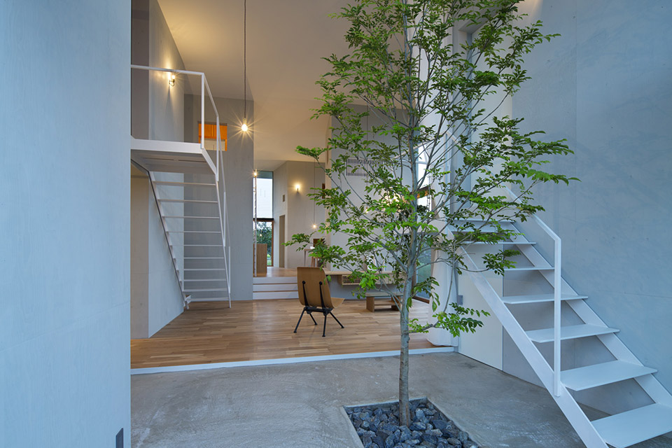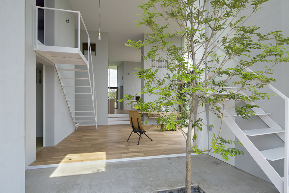 對(duì)自然開(kāi)放,并受到果樹(shù)圍繞的室內(nèi)公共空間讓人感到開(kāi)闊而放松。公共空間的室內(nèi)高度有兩層層高的尺度,為了利用結(jié)構(gòu)體的上層空間,每個(gè)都有專用樓梯到達(dá)上層,其中四個(gè)樓梯放置在公共空間中,還有三個(gè)爬梯分別放置在相對(duì)應(yīng)的結(jié)構(gòu)體自身中。