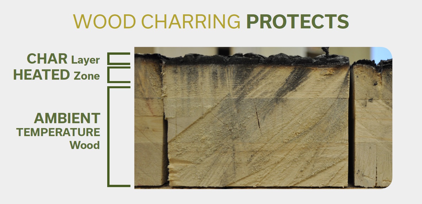 大塊木材通過內層的隔熱層而具有耐火性。當木材暴露于火中時,暴露的表面會燃燒,從而形成自然的碳化保護層。炭化層作為隔離層,延遲了下層木芯的加熱。由于大塊木材是由實心的部件組成,空氣和火勢蔓延被抑制了。炭以可預測的速率(約3.81厘米每小時)形成,以減慢燃燒和火勢蔓延。