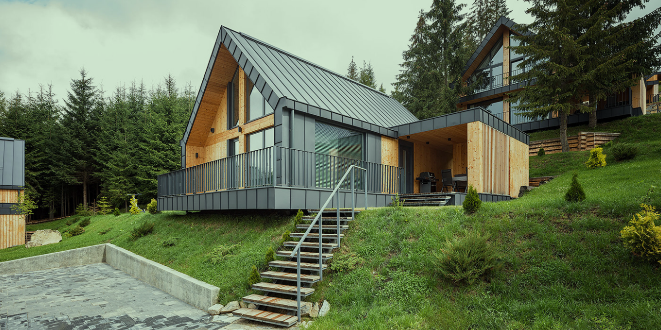 大面積窗戶:在木屋的設(shè)計中,采用大面積的窗戶設(shè)計,將周圍的自然美景引入室內(nèi)。這不僅可以讓居住者隨時欣賞到美景,還能增加室內(nèi)的采光和通風(fēng)效果。