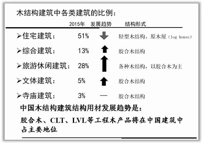 幾十年來(lái),磚混結(jié)構(gòu)已廣泛應(yīng)用于我們的民用建筑中。施工成本低,給人以安全感,耐用性和低維護(hù)成本,而木結(jié)構(gòu)房屋不穩(wěn)定,不安全,易著火,易受害蟲害。遇水分會(huì)導(dǎo)致腐爛和霉變,因此難以接受這種新的木結(jié)構(gòu)建筑。由于對(duì)現(xiàn)代木結(jié)構(gòu)的理解不足,因而產(chǎn)生這些疑問是正常的。只要在成本,安全,保護(hù),功能等方面采取適當(dāng)措施,通過大量的實(shí)驗(yàn)比較,專業(yè)知識(shí)的宣傳,樣板房的示范,特別是中國(guó)古代木結(jié)構(gòu)建筑和文化的影響,我相信人們的思想會(huì)發(fā)生變化,而木結(jié)構(gòu)建筑的生活體驗(yàn)也會(huì)影響人們的固有觀念?,F(xiàn)代木結(jié)構(gòu)完全可以被接受。下圖所示的各類木結(jié)構(gòu)建筑發(fā)展趨勢(shì)也能說(shuō)明這一點(diǎn)。