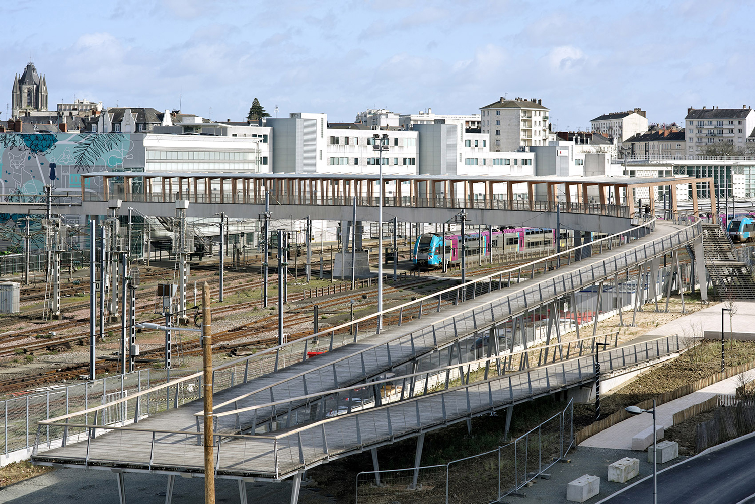 昂熱位于法國西部,是Maine-et-Loire的省會。這座城市位于巴黎和南特之間,在南特東北100公里處,距巴黎約300公里,常住人口153000人。昂熱Saint-Laud火車站是城市的交通樞紐,每天有13趟開往巴黎的高速火車在這里停靠,僅需1小時45分鐘就可以到達(dá)巴黎。此外,這里每天還有40班列車開往南特。車站北側(cè)是Auguste Gauter大道,南側(cè)為Fulton街。車站區(qū)域內(nèi)鋪有一道道鐵軌,總寬度約為70米,在城市間形成了一道巨大的溝壑。原本鐵軌兩側(cè)由一座老舊的鋼筋混凝土橋梁連接,已經(jīng)損毀得十分嚴(yán)重。