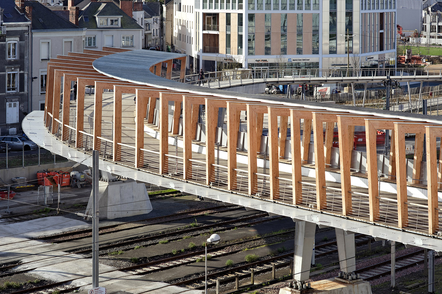 木制框架不僅塑造了行人與場所之間的關(guān)系,還滿足了具體的功能需求。設(shè)計師在施工時將照明系統(tǒng)整合在框架內(nèi),防止天氣和風(fēng)對器材的不利影響。木制人行橋上埋設(shè)了防滑帶,即便在惡劣的天氣里,人們也可以安全行走。St.Laud車站的新步行橋不僅可以幫助人們穿越鐵軌,更是一個新的城市地標(biāo),供人停留、閑逛和交談,看火車來去不息。