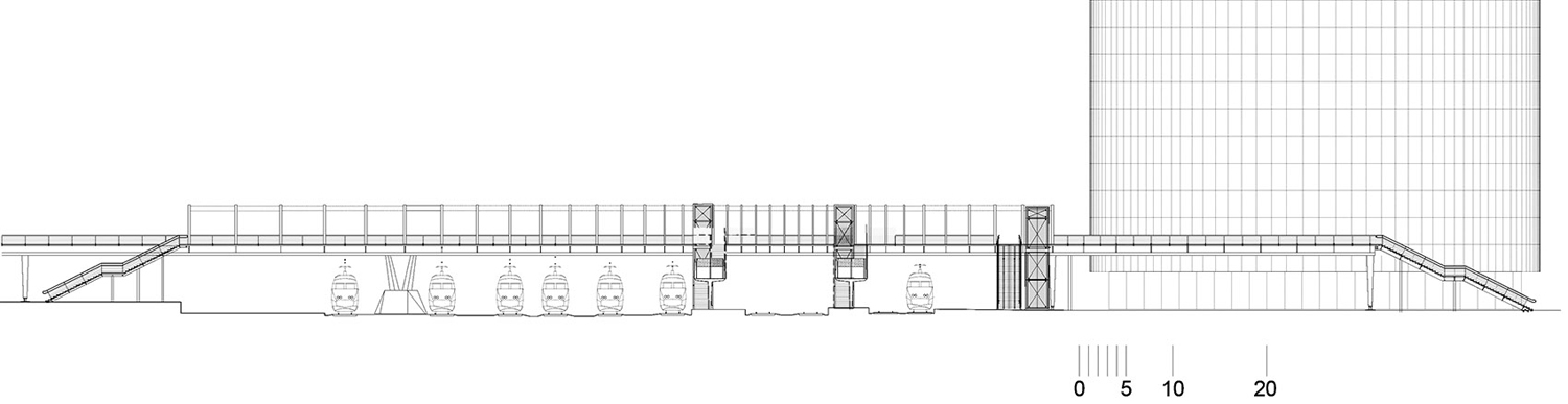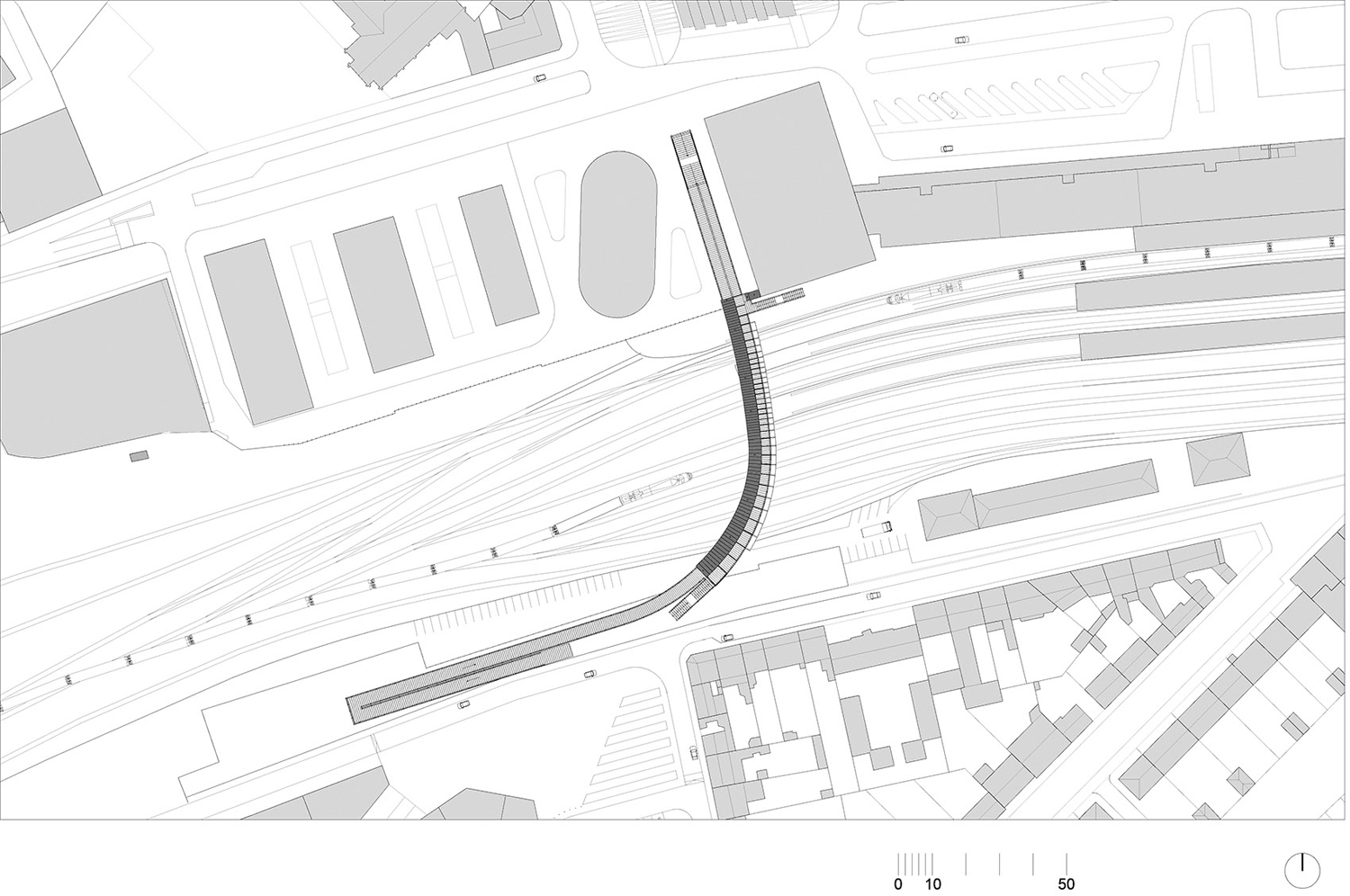 城市開發(fā)計劃對這片區(qū)域進(jìn)行升級。車站一側(cè)的Auguste Gaultier大道上已經(jīng)建造了一棟辦公樓和一座多層停車場;另有一棟酒店正在施工。鐵軌南側(cè)的Fulton街上則將建設(shè)一條新的散步道。這座供行人和自行車使用的天橋是區(qū)域現(xiàn)代化的一部分,由獲得競賽優(yōu)勝的Dietmar Feichtinger建筑事務(wù)所負(fù)責(zé)設(shè)計。他們的設(shè)計遵循城市尺度,跨越鐵軌形成的屏障,并且設(shè)置電梯和樓梯,幫助身體不便的人直接到達(dá)站臺。