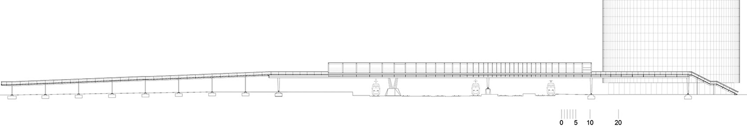 Dietmar Feichtinger建筑事務(wù)所在昂熱Saint-Laud火車站設(shè)計了一座新的橋梁,供行人和自行車使用。橋梁呈柔軟的弧線形,跨越總寬度達(dá)70米的一道道鐵軌,融入到城市的地形之中。橋面由中空箱體和鋼架組成,弧線西側(cè)整合有木制長椅。項(xiàng)目整體優(yōu)雅而輕盈,將不同地區(qū)連接在一起。由膠合木梁組層面的框架支撐屋頂和照明系統(tǒng),呈現(xiàn)出驚人的效果,使橋梁成為一個吸睛的新地標(biāo)。橋的剖面不斷變化,形成動態(tài)的空間,讓人們在進(jìn)入、爬上樓梯、漫步、等待、坐下休息、觀看和離開等行為狀態(tài)下體會到不同的空間特點(diǎn)。項(xiàng)目為一個單體結(jié)構(gòu),尺度與所在區(qū)域相呼應(yīng),施工精美,提升了人們對該區(qū)域的關(guān)注度?;⌒谓Y(jié)構(gòu)讓橋面可以緩慢抬升,連接新建的Place Giffard-Lagenvin散步道和另一側(cè)的公園。三臺電梯和樓梯在車站、酒店,以及開往巴黎和南特的火車站臺之間創(chuàng)造了無障礙連接,方便騎自行車的人使用。橋梁外形美觀,展現(xiàn)了改造后車站地區(qū)的新樣貌。