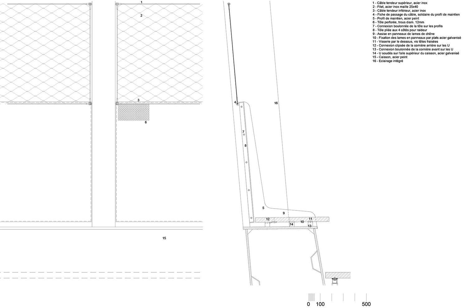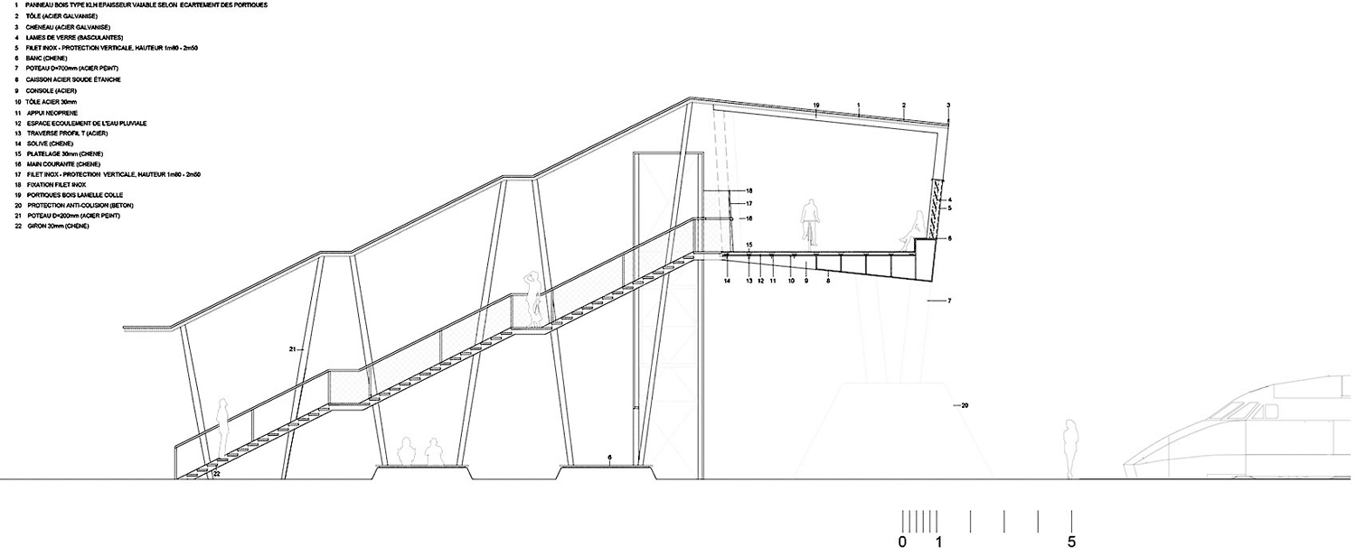 木廊是橋梁中最具代表性的 元素。它們標(biāo)識了橋梁的入口和交匯處,與城市形成對話。同時,它們打斷了人們在橋上的旅程。木廊之間距離不同,結(jié)合橋體本身的弧度,創(chuàng)造了不斷變化的視野,讓人們可以一直從新的角度觀看鐵軌以及來去的車輛。越靠近橋梁中部,木廊越密,隱蔽的空間氛圍邀人停留;在橋梁的兩端,木廊之間的距離更大,提供更加廣闊的城市視野。建筑師對項(xiàng)目體量的考量包含對柱廊形狀的設(shè)計,其傾斜的角度隨運(yùn)動的節(jié)奏變化,截面在通往橋梁中部的過程中不斷擴(kuò)大。越來越開放的框架突顯了橋梁在鐵軌上方的重要性。