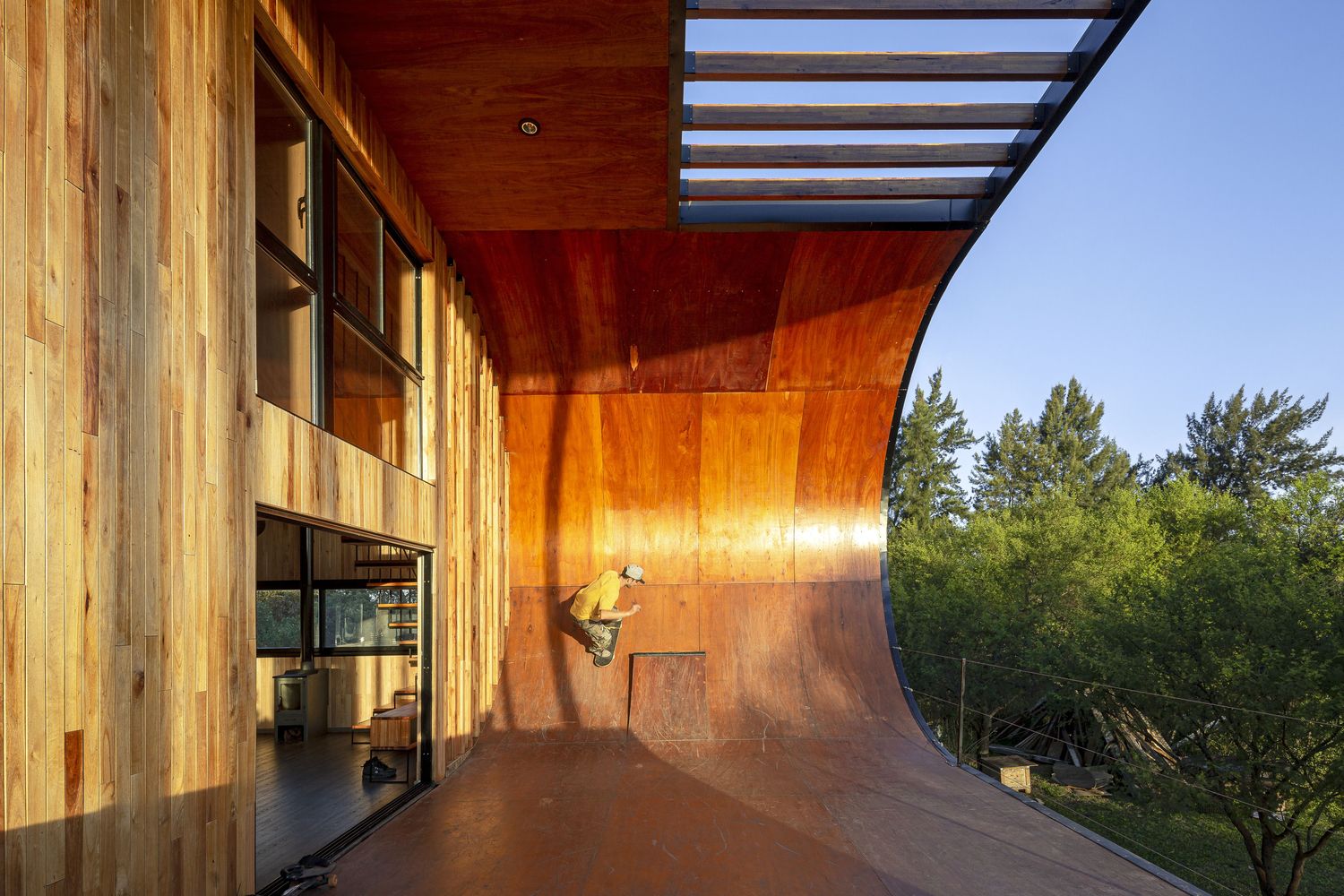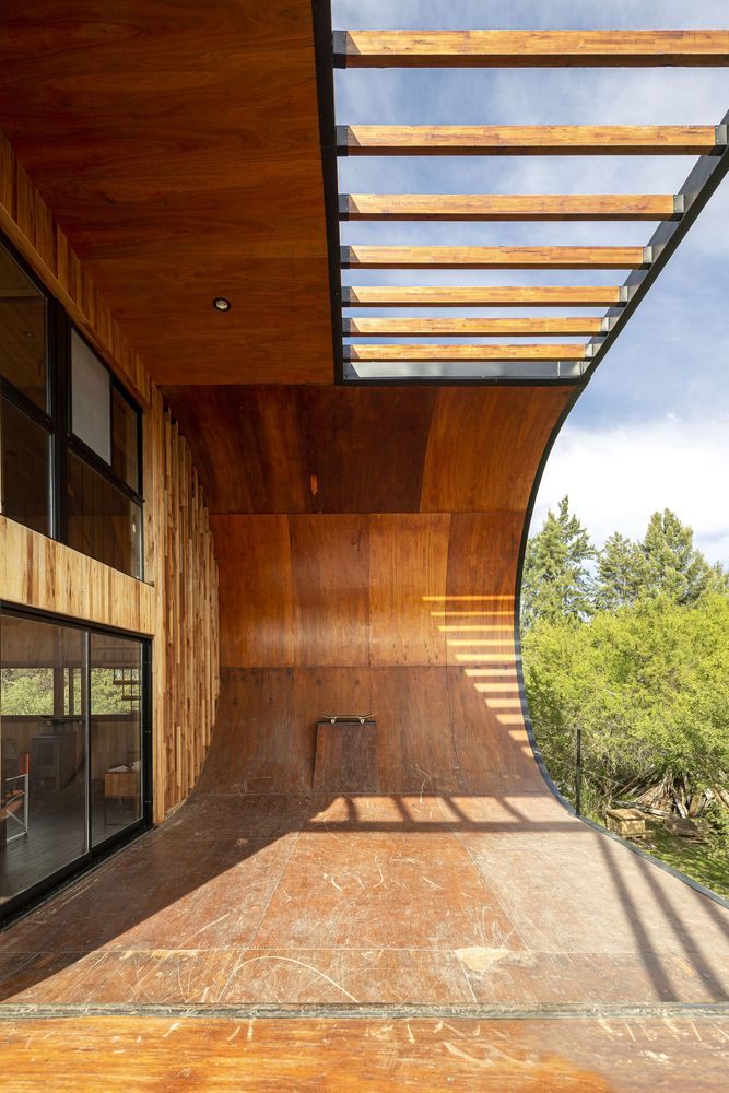 這是一個(gè)100%可持續(xù)的住宅,同時(shí)業(yè)主也可以在上面滑滑板。業(yè)主是一名滑板者,希望房子本身附帶一個(gè)滑板場地。設(shè)計(jì)師將室外陽臺(tái)設(shè)計(jì)成滑道,并在向南一側(cè)設(shè)置一面墻,在住宅東南角形成一個(gè)向上的弧形用于減速。這面墻延伸到了屋檐處,起到阻擋夏天烈日的作用。