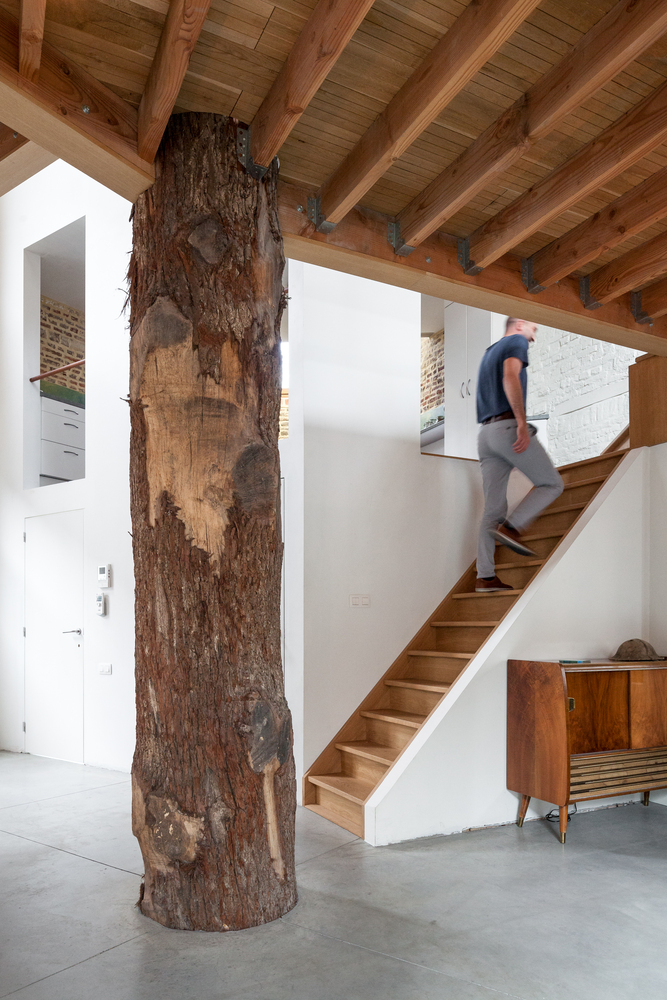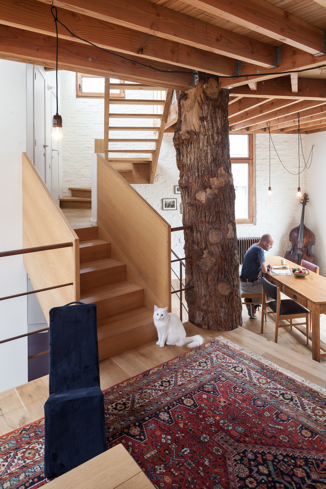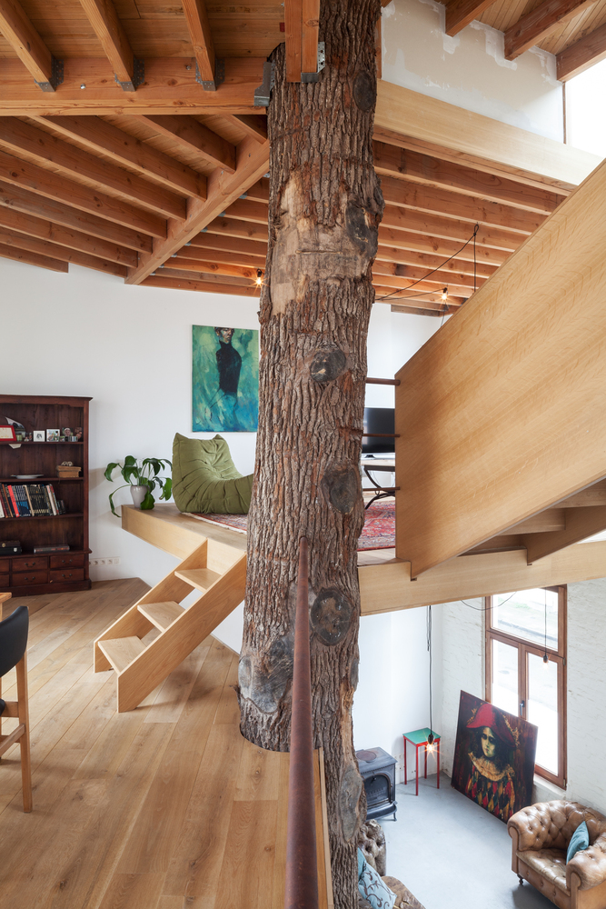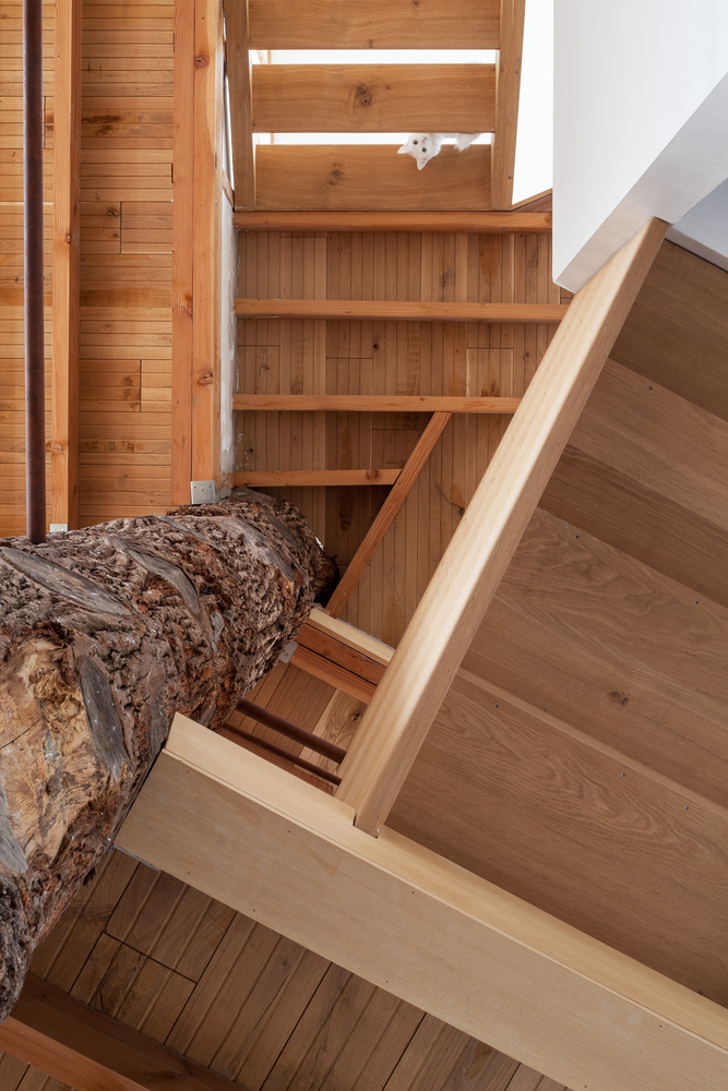 一段橡樹樹干被放置在五邊形平面正中間,作為新的支撐結(jié)構(gòu)。新的上層樓層懸掛在原有外墻和中心支柱之間,呈螺旋式上升。這樣就在生活區(qū)域內(nèi)創(chuàng)造出沒有任何內(nèi)墻的開放室內(nèi)空間。樹干中柱是一個合乎邏輯且經(jīng)濟(jì)實惠的解決方案,它立即為新居所帶來了合適的氛圍。衛(wèi)生間、廚房、入口和儲藏室/洗衣房都設(shè)置在縱貫上下的封閉體塊中。